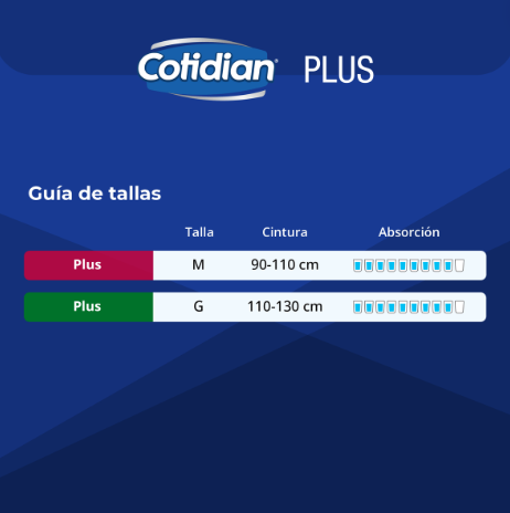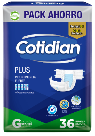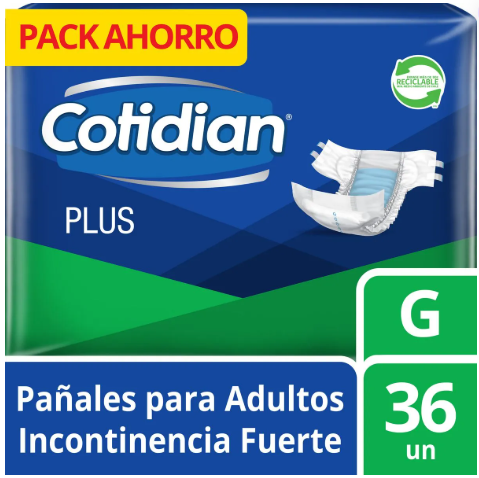 El Pañal de Adulto Cotidian Plus para incontinencia fuerte está diseñado para brindar máxima protección, comodidad y seguridad durante todo el día y la noche. Su núcleo de alta absorción retiene grandes volúmenes de líquido, ayudando a mantener la piel seca y protegida por más tiempo. Cuenta con barreras antifugas laterales y un ajuste anatómico que se adapta al cuerpo, evitando filtraciones y desplazamientos. Su cubierta suave y respirable favorece la ventilación, reduciendo el riesgo de irritaciones. Ideal para personas con movilidad reducida o que requieren protección confiable en situaciones de incontinencia severa. Presentación de 36 unidades en talla G, pensada para uso diario continuo.